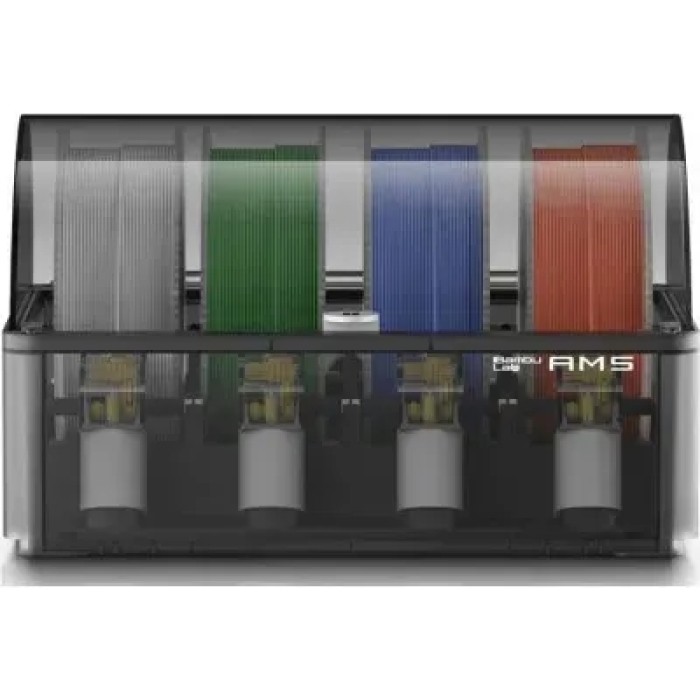 Однією з головних особливостей є можливість підключення системи автоматичної зміни філамента AMS, яка дозволяє не лише створювати багатокольорові відбитки, але й значно полегшує роботу оператора, звільняючи від необхідності вручну змінювати типи пластику залежно від поточного завдання. Також реалізована можливість продовжувати друк із наступної котушки, якщо поточна закінчилася, без зупинки процесу друку. Це зручно, якщо у вас є багато недопечатаних котушок, і вам не доведеться підходити до принтера кожні півгодини. (Блок AMS не входить до комплектації X1C, але його можна придбати окремо. Дивіться у розділі деталей і комплектуючих або обирайте комплектацію X1C Combo.)