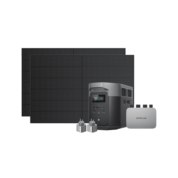 Комплект складаэться з мікроінвертора EcoFlow PowerStream на 600W, зарядної станції Delta Max 2000, та двох сонячних панелей по 400W