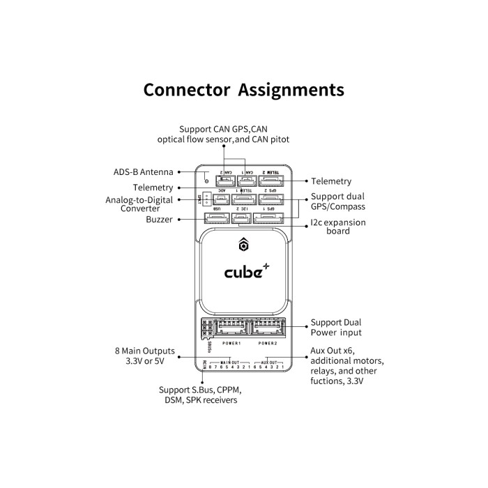 Польотний контролер Pixhawk 2.1 CUBE ORANGE+ - це покращена версія Pixhawk 2.1 CUBE із вбудованим приймачем ADS-B для апаратів на базі Ardupilot. Приймач ADS-B 1090 МГц від uAvionix інтегрований в нову плату, завдяки чому CUBE ORANGE+ отримує інформацію про місцезнаходження від сусідніх літаків, що пілотуються людьми (планерів, вертольотів і т.д.). Усі деталі можна побачити у Mission Planner, включаючи положення, висоту, швидкість, ідентифікатор тощо. Pixhawk 2.1 розроблено, щоб бути простим у використанні, і при цьому неймовірно надійним. Pixhawk 2.1 - стане ідеальним рішенням для проекту, незалежно від того, працює він з метою комерційної, науково-дослідної діяльності або хобі. Pixhawk 2.1 це повністю інтегрований польотний контролер із достатньою продуктивністю для найскладніших завдань. Крім того, продуктивність та надійність датчиків значно покращилася з потрійним резервуванням гіроскопів та акселерометрів, новим H7 процесором та можливістю використання до 3 GPS модулів одночасно.