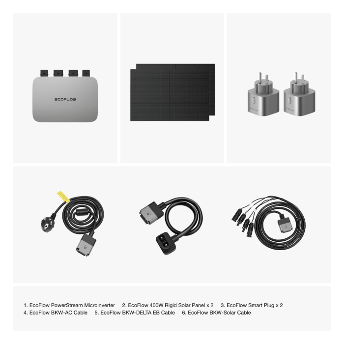 Комплект состоит из микроинвертора EcoFlow PowerStream на 600W и солнечных панелей 2х400